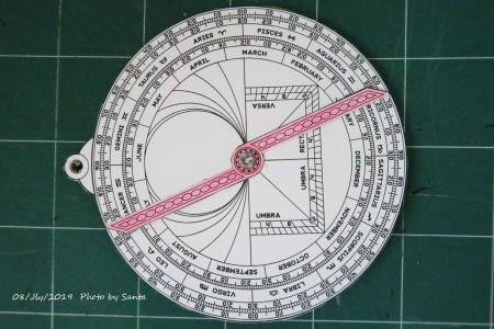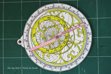 Luminareoさんのペーパークラフトはティンパンがマーテルと一体になっており、北緯35度用にするか40度用にするか迷ったのですが、今回は40度用を使ってみました。代表的な使い方はLuminareoさんのページ出雲さんのページに載っていたものを参考にしました。このような機械が紀元前から17世紀まで使われていたというのは大変興味深いことです。ただ、現代で実用的な値を得るためにはもっと大きなものを正確に作らないと私には使いこなせませんでした。スマホのアプリで何でも出来てしまう時代にAstrolabeをつくってみる意義はこれの設計原理を理解するという教育的なことに限られてしまうのですかね。大変興味深い機器ですので工作教室の題材にしようかとも考えたのですが、リートの切抜きが大変で子供向け工作教室では破綻するだろうことは明白ですし、設計原理も小中学生にはちょっと難しすぎる気もします。リートを透明なフィルムに印刷することも考えないわけではないですが、その点を改良すれば工作教室向けかといわれると難しそうです。Astrolabeのことを伝えていくには現段階では何か他の方法を考えたほうがよさそうだという結論に達しました。