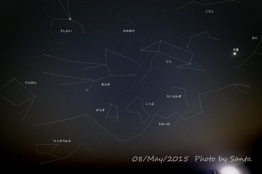 うみへび座は東西にとても長い星座です。 上りはじめから上り終わるまでに10時間くらいかかります。 この写真はフルサイズの一眼レフに焦点距離が14mmの超広角レンズをつけて撮影しています。 明るい星があまり無いので分かりにくいですが、春の星座のしし座とおとめ座が見えるときはその下に長いうみへび座があることを意識するといいかもしれません。